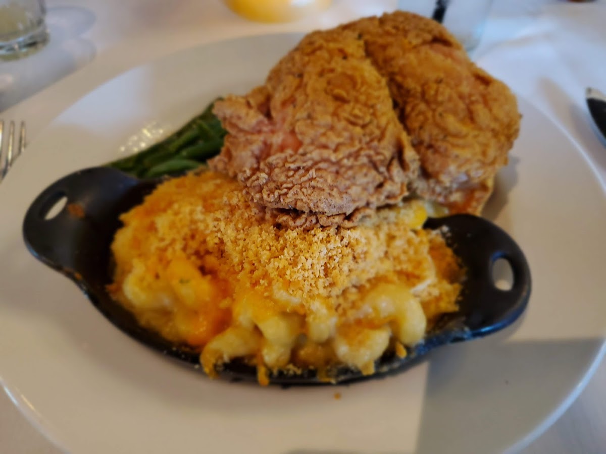 How cow! This is a high end, date-night restaurant bring your husband, boyfriend,, wife, maybe even your girlfriend to this wonderful place. It has BBQ dishes but is much much more than that. First, the staff are highly professional, doting and there are tons of them. The waiter, the room Maitre d' and many others speckled around the restaurant. They care! The music was barely discernible and might have been the bar Tv din reaching out table. The chatter was a little loud so that I had to talk loudly to be heard and place a cupped hand to my ear to hear. :-( Maybe the owner should consider heavy drapes or sound deadening wall and ceiling coverings. The fried pimento cheese sandwich was stupendous! It was fried to a perfect crispy crust, the cheese was melted to a velvety smooth dollop and served on a very shallow pond of toothsome sauce. The fried chicken was a show stopper, eating it was a drop-the-mike moment and truly one of the best I've ever had...by far. Perfect crust and seasoned and cooked just right, plus moist and very flavorful chicken. The tater tots were not so crisp, not much honey and the jalapeño specs were concentrated onto a few of the tots rather than applied to all or most. Suggestion to chef--brush on a light coat of honey then place in a bag with finely minced jalapeño and lightly shake. Just trust me. Try it. The biscuit was excellent --cooked just right and prepared with conscience and thought. Moist and some wonderful spread was a pleasant surprise. If go back!